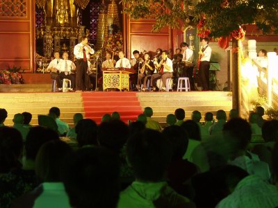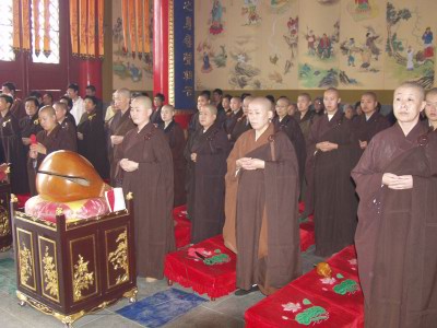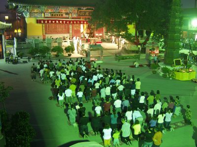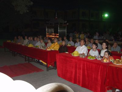 据荐福观音寺报道:2006年10月6日,适逢日光菩萨圣诞吉日,天津荐福观音寺隆重举行了上大供、放生及拜月吉祥法会,有近5000名信众随喜道场。晚八时,还举行了中秋赏月联谊会,邀请寺院护法、工作人员及家属共同参加,在这秋高气爽,慧风和畅的美好时节,天津弘一佛乐演唱团的法师和居士表演了精彩的节目,正所谓“灯前树下同邀月 月映秋田心无别”。