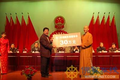 据法门寺报道:9月29日上午,扶风县县委、县政府及宝鸡市慈善协会在关中风情园召开了扶风县慈善协会成立暨“慈善一日捐”大会,县委、政府、市慈协的有关领导以及各界的企事业领导都参加了大会。法门寺代表智超法师在大会现场为该协会捐款30万元人民币,以资助慈善事业的发展。同行的还包括法门寺副寺来正法师,佛学院贤空法师,大知客洪利法师,还有佛学院的六名学生也参加了此次大会。