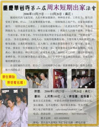 随着时代的飞速发展,人们不断加紧脚步,种种的矛盾、工作压力,使生活受到了影响。经云:「在家繁琐犹如牢狱,一切烦恼因之而产生;出家宽阔犹如虚空,一切善法因之而增长。」出家的功德如偈云:「孔雀虽有色严身,不如鸿鹄能高飞;白衣虽有富贵力,哪有出家功德深。」然而有人因缘不成熟,不能尽一生而出家。有鉴于此,今年5月,重庆华岩寺弘法部特发起了首届 “短期出家”法会。 旨在弘扬佛法,净化人心,实践传统佛教仪制,方便有缘人体验僧团生活,修身进德;让我们暂别嚣尘,走入佛门,在佛法智慧的指引下,使功德、道业、学业、事业在一年里都能百尺竿头更进一步。更重要的是在短期出家期间,发出离心,修出离法,种出世之因,速离生死大海,找回心灵之归宿。透过听经闻法,参禅作务,学习行解并重的出家生活;从行住坐卧中感受佛法的清凉,体验六和敬的僧团生活。