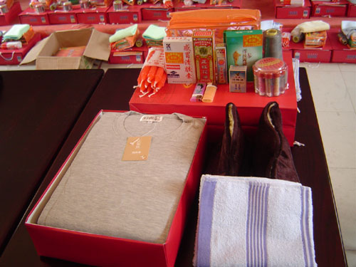 供僧物品:宜而爽保暖内衣1套、毛巾1条、棉鞋1双、棉褂1件、蜡烛10枝、打火机2个、针线盒1个、线1个、药品1包、旅行包1个。