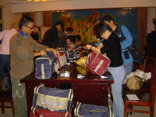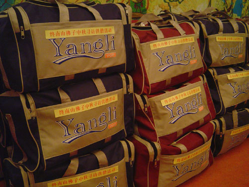 忙碌中~~~~把所有的物品分装在旅行袋里,连同袋子一起供养法师。这样师父们下山要买东西也能用上。