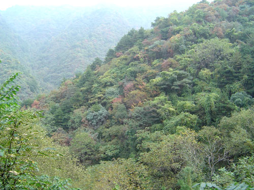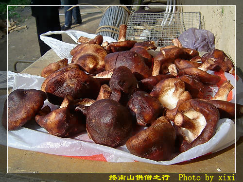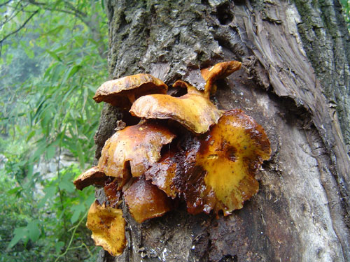 树上长了几朵鲜艳的蘑菇。终南山的蘑菇很多,不过大多有毒的,听说去年就有几位住山的师父吃了毒蘑菇,幸好抢救及时。