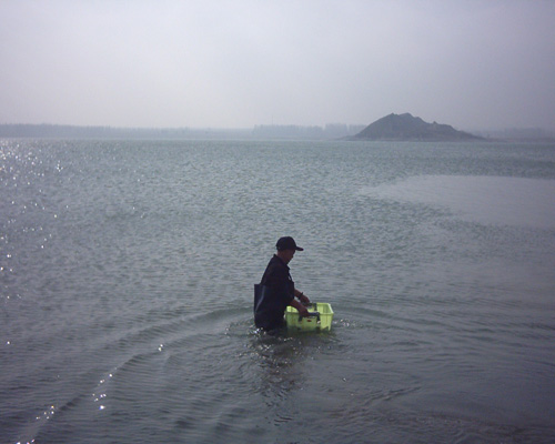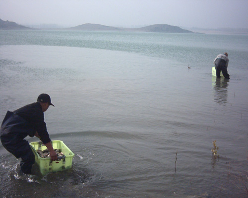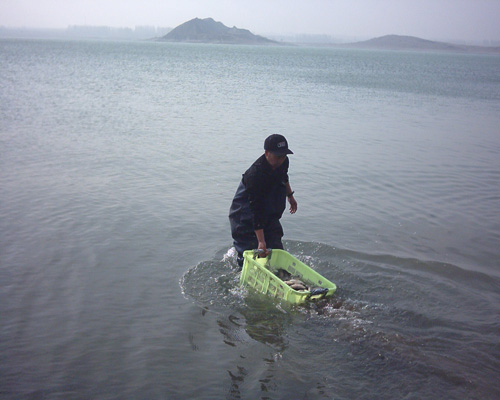 为了防止捕捞,都是这样把鱼篓拉到水中间在放生。
