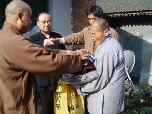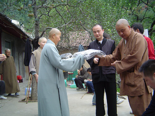 在清凉茅棚的小院大家把棉衣等物品供养给藏圆法师。住在终南山清凉茅棚的藏圆法师已经住山13年了,他的茅棚比较偏僻,上山的小道长满了草,在开示中法师一直很谦虚,讲自己业障重,在山中求忏悔。当讲到如何修行时,法师引用永明延寿禅师的偈语:“有禅有净土,犹如带角虎,现世为人师,来生做佛祖。无禅有净土,万修万人去,若得见弥陀,何愁不开悟。有禅无净土,十人九蹉路,阴境若现前,瞥尔随他去。无禅无净土,铁床并铜柱,万劫与千生,没个人依怙。” 所以法师认为修行以念佛为稳当。