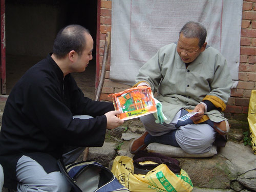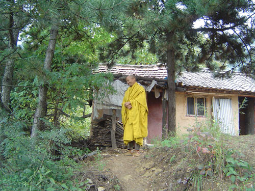 一个人住在茅棚里的86岁常华尼师,拿到大家供养的物品,竟然不知道是什么东西。我们随访的年轻居士,主动给老法师顶礼,老法师为他摩顶,并祝愿大家吉祥,临送出门对大家讲,今天看到这么多的年轻佛子,她很高兴。她给大家讲述了一个人在山里是怎样住了26年,她的双手在自己修建茅棚搬石头时磨出了老茧,住到现在已经不知到外面的世界发生了什么,人家给她讲“别墅”,她问人家“别墅”结什么果子。人家送给她月饼,她看到精美的包装盒,以为是什么经书,拿到手里就举过头顶膜拜。可是她的爽朗笑声让人忘却她是个86岁的老人。