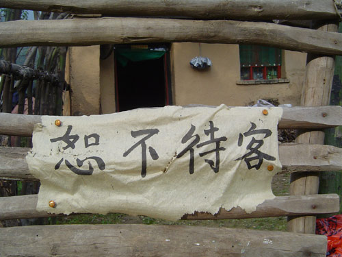 透过茂密的树枝,我们看见茅棚的门被砖堵死了,上面写着“闭关”两个字。经带路的法师隔着封死的院墙呼唤好久,才从墙上露出里面闭关的师父,据说,她在这里闭关已经一年了,并且止语,所需物品只能隔着墙用绳子递送。