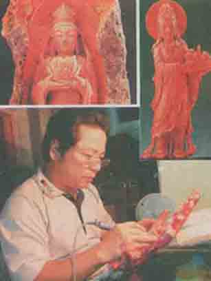 | 黄忠山以珊瑚为材,以心为刀雕刻佛像,右上图为鱼篮观音,厚六.二公分,高三十一公分,宽十二.五公分。左上图为岩户观音,厚十公分,高三十公分,宽十二公分。 |