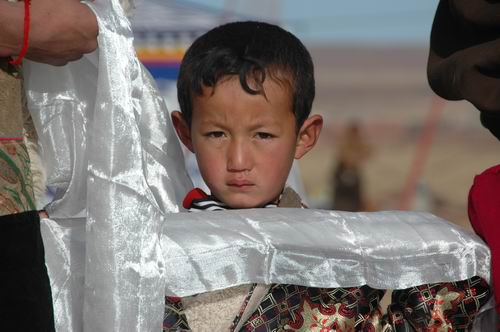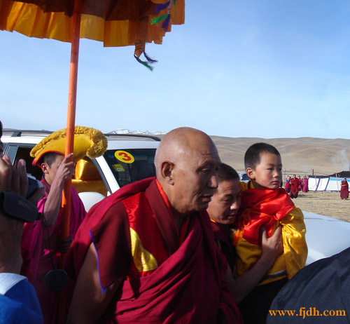 清晨的甘南大地沐浴在明媚的阳光中,沿途山谷中有几天前就从各地赶来参加坐床大典的藏民搭起了洁白的帐篷,近万名藏族同胞身着最隆重的节日盛装在沿途手捧哈达,静静的等待迎请车队的到来。10点钟,奔腾的马队伴随着人们欢呼声由远至近,空中飞扬着吉祥的风马旗,平静的草原沸腾起来了,迎请车队到达桑科接待站,稍事休息,贡唐仓活佛转世灵童为信众摸顶。12点钟,迎请车队到达佐盖接待站休息,午餐结束后,贡唐仓活佛转世灵童为等待以久的信众摸顶,下午3点迎请队伍到达琼泽滩贡唐囊欠接待站,当日住琼泽滩。