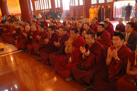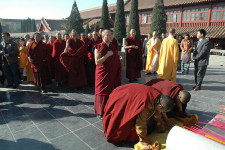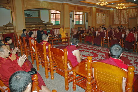 据柏林禅寺报道:11月5日上午,中国藏语系高级佛学院师生一行70余人,在李印来院长带领下,由河北省佛协副会长张铁军陪同来到柏林禅寺,受到柏林禅寺明憨法师和利生法师的热情接待。他们陪同客人参观了赵州禅师舍利塔和万佛楼,在万佛楼进行了诵经祈祷活动。参观完毕后,明憨法师在指月楼和客人进行了座谈交流。