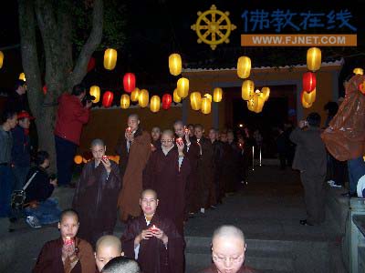 千年古剎普济寺圆通殿(即观音殿)前信众济济,恭敬站立,按序接灯传灯,海天佛国沉烛光闪烁,沉浸在金色琉璃中。