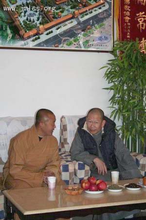 道安法师陪同智仁法师一行朝拜了鸠摩罗什舌舍利塔、参观了大雄宝殿、鸠摩罗什祖师纪念堂、厢房,并讲解了总体规划和修建情况。之后,在接待室进行了亲切交谈,道安法师讲到罗什寺修建到目前的规模,离不开当地市、区领导和海内外高僧大德的支持,罗什寺总占地面积102.4亩,现在修建工程只是刚刚开始,展望未来,修建任务任重道远,1998年香港宝莲禅寺圣一长老对恢复鸠摩罗什祖庭非常关心,当时由于旧原址是公安、检察、法院、武警中队、看守所五家单位办公,后来一直失去了联系,这次智仁法师专程来访非常感谢。智仁法师对罗什寺宏伟的修建十分赞叹