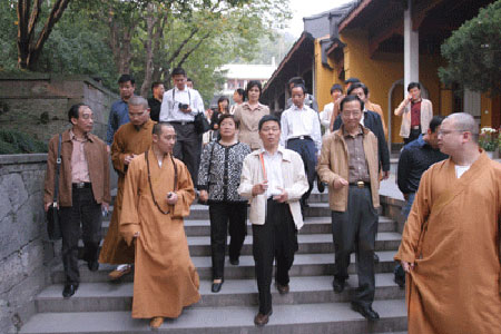 据灵隐寺报道:杭州为创最佳旅游城市,作为千年古刹的灵隐寺是杭州重要的旅游单位之一。十月三十一日下午,杭州市政府副市长项勤、副秘书长杨菊芳为首的四大班子二十余人莅临灵隐寺进行卫生检查。灵隐寺监院觉乘法师、知客戒兴法师、监院办如义法师等在山门外热情接见了副市长一行的到来。