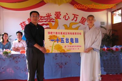 据南普陀在线报道:11月7日,厦门南普陀寺慈善会慈善处德鸣法师、妙如法师和宣传室觉明法师一行,来到福建省宁德市向蕉城特教学校捐赠了十五台电脑。