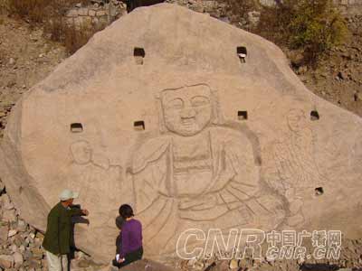 近日,北京市延庆县佛峪口水库大坝下面一尊嘉庆年间刻成的佛像,被沙石掩埋了30多年后,在施工时被重新挖掘出来。这顿佛像高3.6米,宽6米,刻在一块巨大的石头上,当地人称之为“玉佛”。