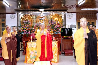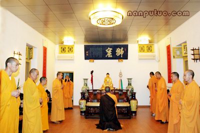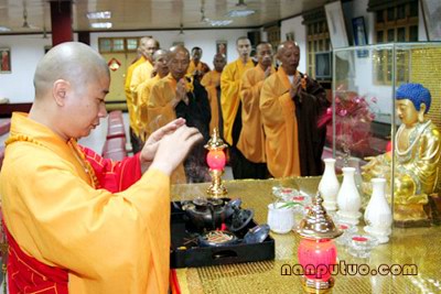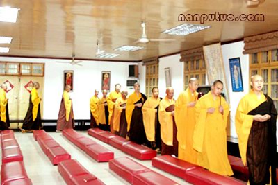 据南普陀在线报道:11月12日晚六时三十分,南普陀念佛堂冬季精进佛七举行撒净仪式,南普陀寺方丈则悟法师在两序僧众的迎请下亲临念佛堂主持仪式。