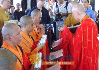 这次为观宗寺第八次举办传法大典,仪式在观宗的大雄宝殿内举行。觉光长老根据天台宗历代祖师的传承,传授法嗣。