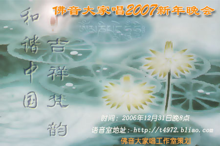 佛音大家唱报道:和风东来,普润大地,为迎接2007元旦到来,佛音大家唱语音室将于12月31日晚8点举办“和谐中国 吉祥梵韵——2007新年晚会”,献上网络佛友一份虔诚的祈愿!届时将隆重发布多首原创佛教歌曲,将邀请词曲作者畅谈创作心得,也将和您一同回顾佛音大家唱推广的多首经典佛曲,重温清凉佛乐带给我们的那份感动.晚会中诸位指导法师将莅临佛音大家唱语音室,为和谐祈愿祝福!