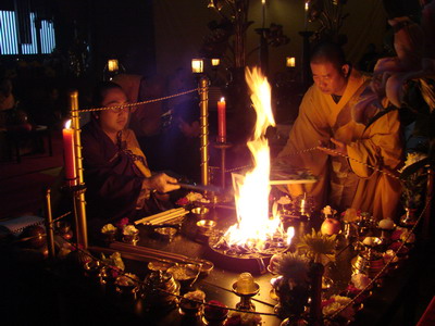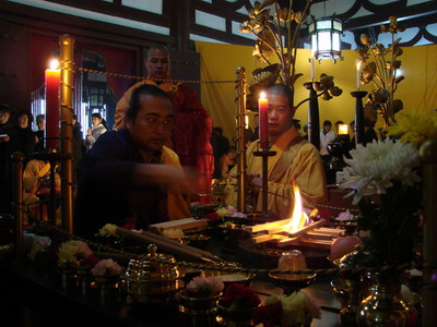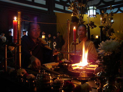 10月26日,唐密祖庭青龙寺举行结缘授明灌顶法会。在25日法会开始前,陈精文上师在唐密灌顶坛内举行了隆重的火供,近200多名西安居士参加了火供。据悉这次报名参加结缘授明灌顶法会的有近400多人。本次法会全部由香港旭日集团赞助举办,旭日集团总经理杨勋先生亲自参加了灌顶法会。