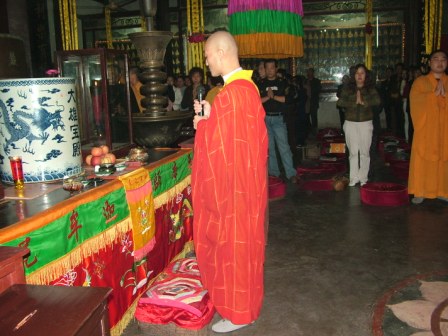 重庆佛教在线11月9日消息 据重庆华岩寺报道:2006年11月8日晚,作为观世音菩萨法会的重要内容,重庆华岩寺举行传灯法会和供天法会。晚上七时,华岩寺及重庆佛学院的僧众以及500多位居士共同参加了传灯法会,传灯法会寓意以灯光相续,带给人们温暖、智慧、希望、吉祥, “一灯能破,千年愚暗。虔诚供养,诸佛菩萨。祈请诸佛,为我点亮。灯光点点,佛光绵绵”。随后,举行供天法会。丰盛的斋天果物、菜蔬等供品供奉在庄严、清净的祭坛上,护法居士跟随法师依文表白,唱赞三宝,祈愿诸佛菩萨、天龙八部护佑世界和平、国泰民安、风调雨顺、普天吉祥。