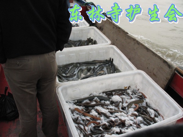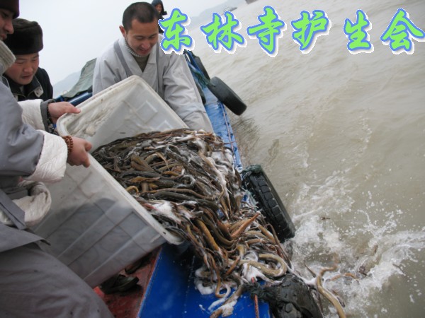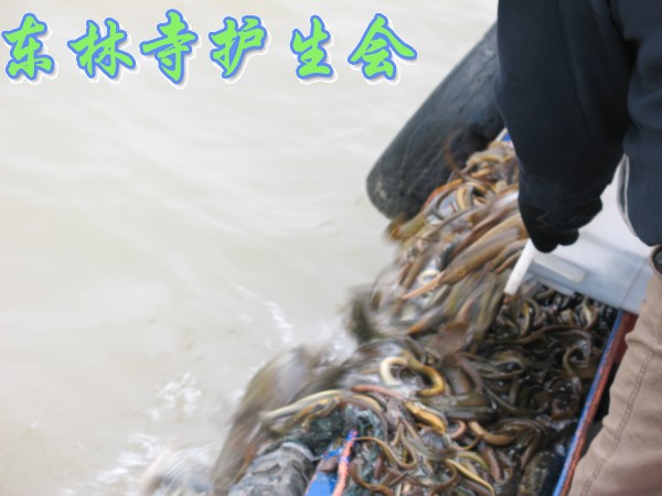 一桶桶黄鳝被放入鄱阳湖,虽然天寒,但还是感觉非常欢喜