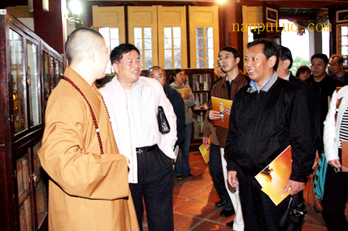 参访团在则悟大和尚的指引下,首先来到大雄宝殿及大悲殿、法堂后来到普照楼进行座谈。参观各殿堂,同时大和尚为大家解说了我寺的寺院建筑、佛像塑铸、佛教典故、历史沿革、现状发展、教育管理、慈善弘法等情况。