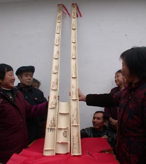 据了解,这根已被削开的竹片长二.二五米,每节中都有一幅不同的「菩萨」图案,或座或站,或擡头或昂然,真是令人称奇。