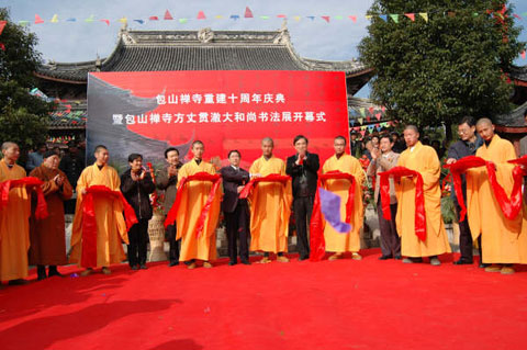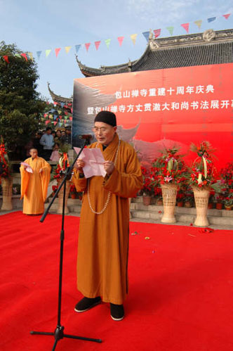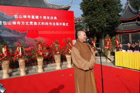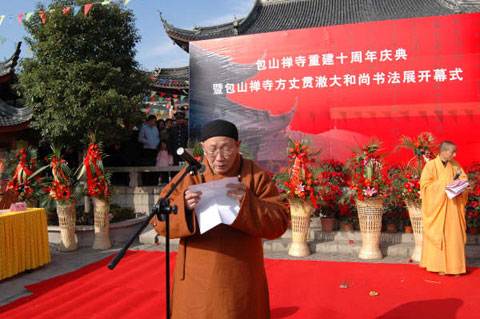 日前,江苏省苏州市吴中区包山寺玉佛开光、重建十周年暨贯澈法师个人书法展在大雄宝殿前广场举行。