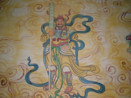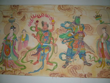 在宏伟、庄严的药师殿正中,清净庄严的药师如来慈悲凝视众生,四周墙壁绘有栩栩如生的佛教壁画。其中,两边绘的是“药师十二神将”。据正在作画的冯画师介绍,“药师十二神将”是药师如来的分身,或其眷属,是围绕于本尊的守护者,又称十二药叉大将,或十二神明,是顺应药师如来之十二大愿而化现之羯摩神。而后面墙壁上绘的则是二十四诸天。这二十四诸天指的是佛教的护法神,又可称“诸天鬼神”,包括佛教的菩萨、道教的神仙等。
