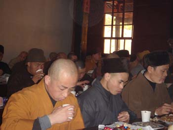 告完“生死假”后,接着师父们在应供堂举行了“普茶”活动,诚信法师在“普茶”活动上做了简短的开示。他说:“打禅七目的是克期取证。打七,就是在修行的道路上,每年集中一定的时间,进行强化训练,决定要在修行上达到一定的目标”。