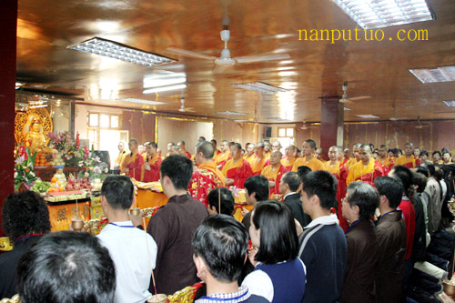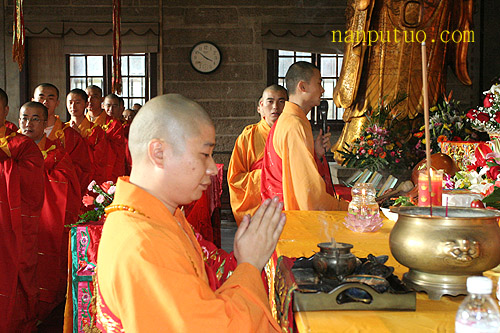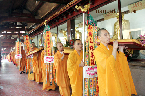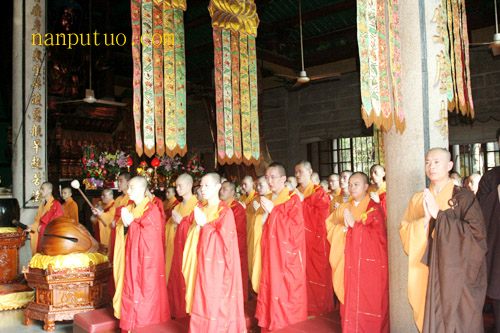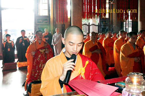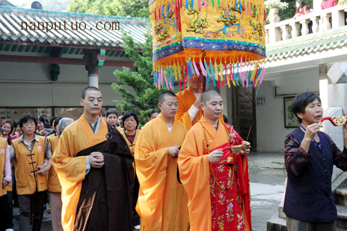 今天上午,进行延生普佛,下午2时往生普佛,与绕佛期间举行隆重的送圣仪式。从下午二时许,大雄宝殿前站满信众,接着锣鼓喧天,圣号不断。仪仗队持幡、灯、香、果、花等所有参加送圣队伍来到念佛堂进行诵经仪式,之后依则悟大和尚为主法的仪仗队及法会的所有法师和护法居士绕各殿堂的外围一匝来到天王殿前,进行作法、礼拜、回向,如是普资恩有,冥阳两利,将功德圆满回向十方法界众生。