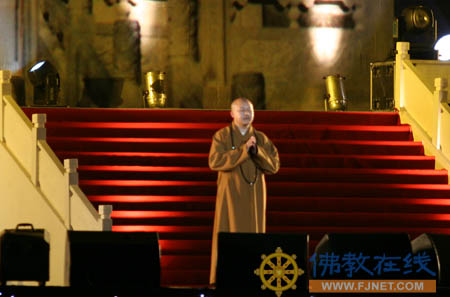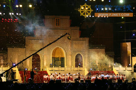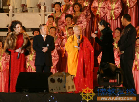 在悠扬的《菩提偈》声中,莅会法师步入会场,著名演员曾志伟、侯勇、李若彤、施明登场主持,引起了全场的沸腾和注目,掀起了晚会的第一个高潮。