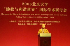 柏林禅寺网站报道:由北京大学宗教学系、加拿大英属哥伦比亚大学亚洲学系主办,柏林禅寺、慈济加拿大分会协办的“佛教与和谐世界”国际学术研讨会开幕仪式于11月24日上午在北京大学百周年纪念讲堂隆重举行。国家宗教事务局、北京大学的有关领导,中国佛教协会秘书长学诚大和尚、河北省佛教协会副会长明海大和尚等佛教界人士,以及来自海内外的近百名专家学者出席了开幕式。