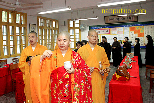 12月4日15时30分进行熏坛和补经法事活动。首先礼请主法和尚,僧俗四众齐装威颜,仪仗队在僧值明律法师带领下提具拈香,伴随悦耳的引磬声来到方丈楼,南普陀方丈则悟大和尚端坐室中,仪仗队庄严有序缓行至大雄宝殿,当炉香赞唱起,则悟大和尚开始代众礼佛。接着大悲咒声声不断,大和尚执持杨枝净水依次遍洒南普陀普利道场的各个坛口。