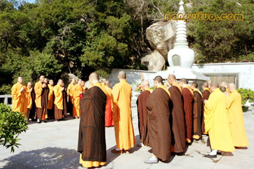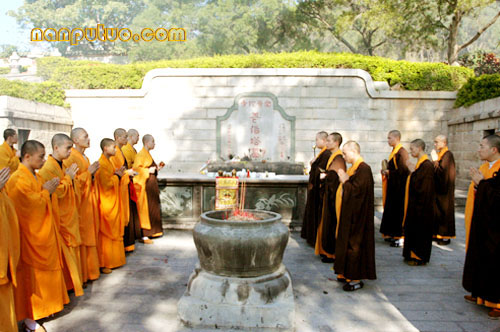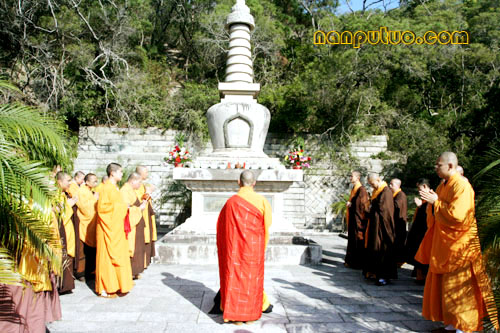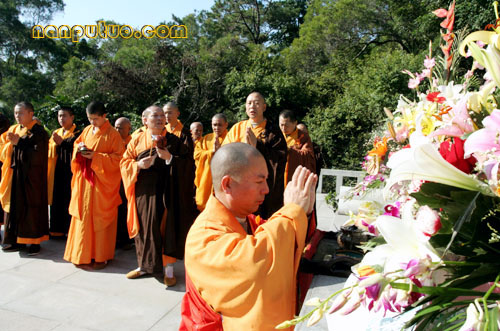 昨日上午9时,南普陀寺全体僧众及闽南佛学院学僧穿袍搭衣,僧相庄严,在本寺首座了法法师的率领下前往法堂、祖堂、功德堂及转逢和尚、会泉法师、妙湛老和尚等塔墓前祭供祀先。