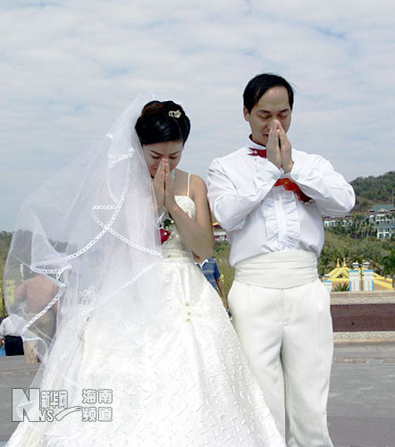 新郎谢伟告诉记者,他和他的爱人以前从未来过南山,是从网上看到海上观音介绍后,就决意举行这样的有特殊意义的婚礼。他还笑着说,说不定哪天,他们会来南山还愿的。