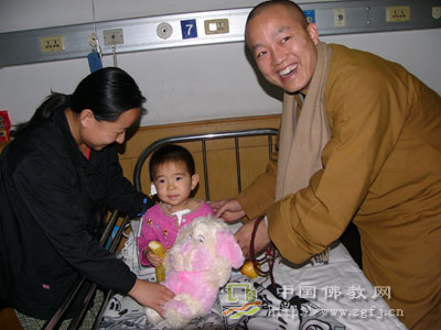 据中国佛教网报道 12月22日,河北省佛教协会常务副会长、赵县柏林禅寺住持明海大和尚、河北省佛教协会秘书长肖占军、红十字会会长张淑琴一行数人在省儿童医院李院长的陪同下慰问省儿童医院孤残儿童。