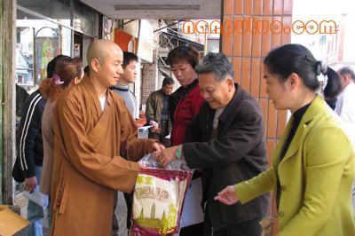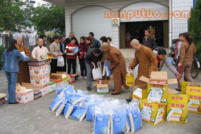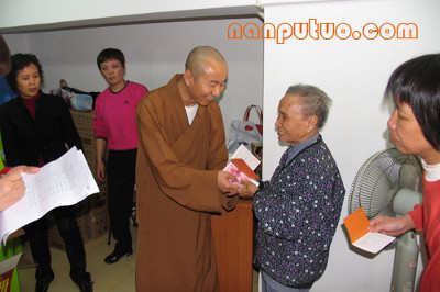 据南普陀在线报道:12月20日上午,为响应中华慈善总会关于组织开展2007年元旦春节期间“慈善情暖万家”活动的号召,南普陀慈善会普陀、德鸣、觉明、慧暄、天真、妙如、通灵法师一行,来到厦门市思明区滨海社区慰问了46户贫困居民,将生活必需品送到贫困户手中,又向特别困难的居民发放了5000元慰问金。