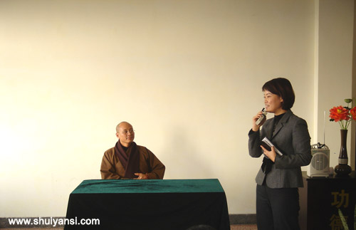 讲座结束后,秦皇岛市佛教协会会长存海法师再次诚挚的邀请界诠法师明年莅临秦皇岛市弘法,居士代表献花、唱颂佛曲供养界诠法师,感谢法师的慈悲开示.