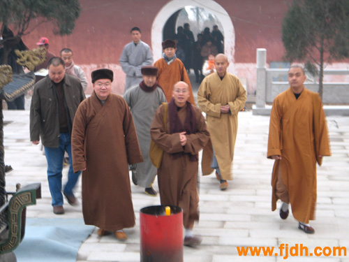 2006年12月21日下午,福建平兴寺住持界诠法师莅临河北昌黎水岩寺参观,水岩寺住持存海法师携寺院僧众于山门欢迎界诠法师一行的到来,随后前往大殿礼佛并参观寺院,唐山恒安集团董事长、水岩寺护法丁立权居士陪同参观.