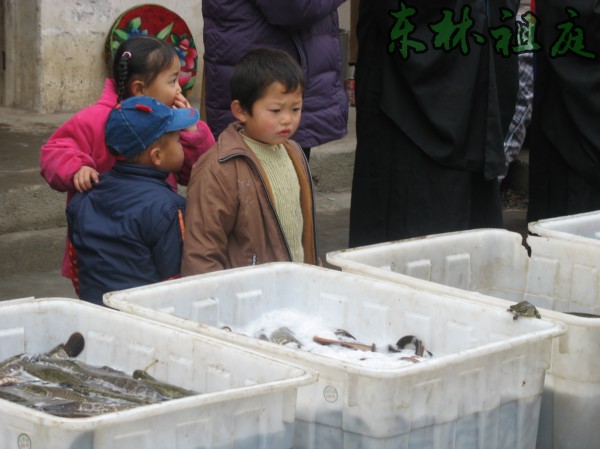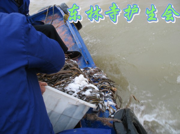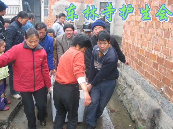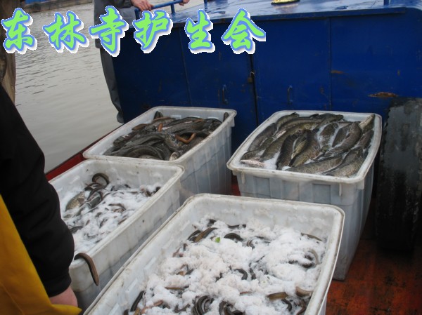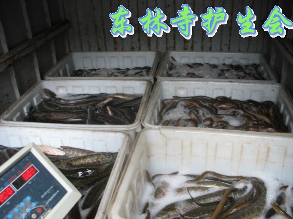 一大早,护生会人员和参加佛七的居士十余人冒着小雨出发,到了九江市场,雨越下越小,渐渐的停了。现在寒冬腊月,临近春节,大多数人家都在办年货,而年货又大多是众生肉啊!因此,东林寺护生会不顾大寒,去抢救众生。在熙熙攘攘的市场里,随处可见的都是众生的血肉之躯,心不停的在颤动,抓紧时间抢救众生生命吧,生怕晚一步被别人买去杀了。经过2个小时的购买,装满了一货车6大箱的众生。所救物命有,乌鱼、黄鳝、泥鳅等,共计花去23275元人民币。