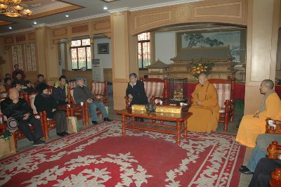 大家首先来到指月楼座谈,随后在万佛楼举行了消灾祈福法会和上大供仪式。