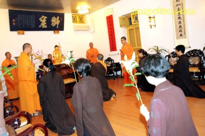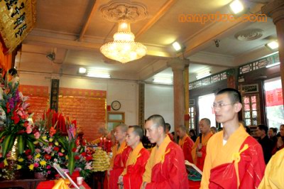 上午七点半,礼请主法和尚。僧俗四众齐装威颜,在僧值明律法师带领下提具拈香,伴随悦耳的引磬声来到方丈楼。本寺方丈则悟法师端坐室中,仪仗队庄严有序缓行至法堂。当杨枝净水赞唱起,则悟法师开始带众礼佛。接着大悲咒声声不断,以严净坛场。
