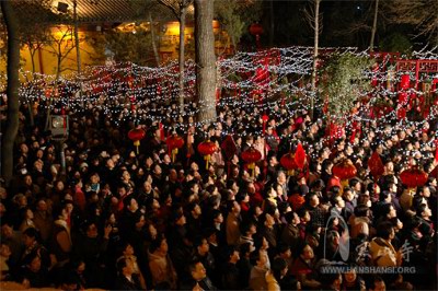晚上11时许,王荣一行走进了枫桥大街。这里仿佛是灯的世界、人的海洋,写着“福、禄、喜、寿、缘”字样的红灯笼沿街悬挂,喜气洋洋。一路上,王荣不断向市民游客挥手致意。寒山寺还举办了以《枫桥夜泊》为主题的书画展,共展出180多幅书画珍品。王荣对秋爽方丈和性空长老说,寒山寺充分发掘宗教文化的内涵,不仅吸引了越来越多的游客,而且为创建和谐社会起到了积极作用。接着,王荣在胸前别上了象征吉祥如意的红色中国结饰物。