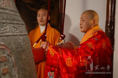 晚上11时30分,寒山寺方丈秋爽法师登台为全体来宾祈福。11时42分,秋爽法师开始敲响108下除夕钟声。随着钟声响起,人群静穆,有人神情激动,有人低眉凝思,无数的手机和摄像机举起,录下眼前珍贵的一刻,向远方的亲友传递祈福的钟声。无数心愿随钟声放飞。