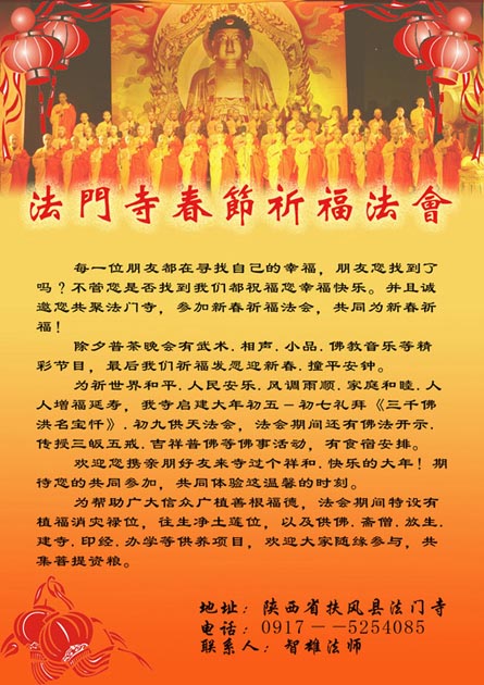 每一位朋友都在寻找自己的幸福,朋友您找到了吗?不管您是否找到我们都祝福您幸福快乐。并且诚邀您共聚法门寺,参加新春祈福法会,共同为新春祈福!