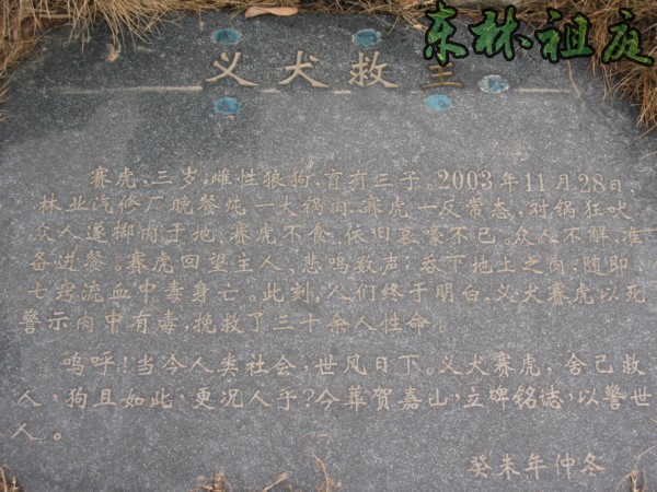 赛虎的墓碑是陵园经理亲自刻的,上面写着:“赛虎,三岁余,雌性狼狗,育有十三子。2003年11月28日,林业汽修厂晚餐炖一大锅肉,赛虎一反常态,对锅狂吠。众人遂掷肉于地,赛虎不食,依旧哀嚎不已。众人不解,准备进餐。赛虎回望主人,悲鸣数声,吞下地上之肉,随即七窍流血中毒身亡。此刻,人们终于明白,义犬赛虎以死警示肉中有毒,挽救了三十余人性命……今葬贺家山,立碑铭志以警世人!”