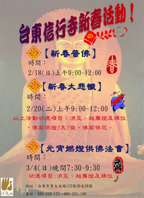 据法鼓山全球资讯网报道:台湾省台东市信行寺将于2007年2月18日到3月4日举行系列活动。活动包括:2月18日,新春普佛;2月20日,新春大悲忏;3月4日元宵燃灯供佛。