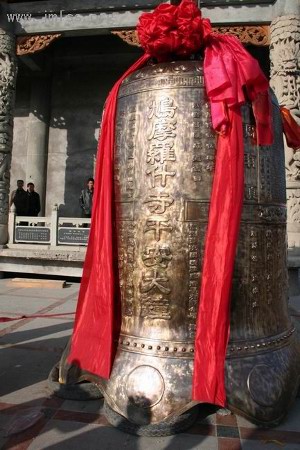 接着,在理智法师的主持下举行了迎接祈福法会,经过一个多小时的虔诚礼佛、诵经祈福后,开始聆听平安钟声,钟声象征着如意、平安,当理智法师敲响第一声时,居士争先恐后的围上来要摸一摸、敲一敲,钟声浑圆。浑厚的钟声在罗什寺上空回鸣,闻钟声如提醐灌顶,还有的居士纷纷为大钟挂红,表达自己渴求佛力加被、幸福美满生活良好夙愿。鸠摩罗什寺平安大钟用锡青铜铸造,重九吨半,口径2米,高3米,造价158万元。钟体外,镌铸《般若波罗蜜多心经》一卷及铭文两千多字;上面刻有泰国邱慧琳、新加坡何惠荣、兰州刘娉、武威王森斋主的功德芳名,他们分别为大钟捐助二十万元。它采用[蒲牢雕龙]作钟钮,以八瓣莲花为钟唇,每瓣铸有一处撞钟点,外观大方。
