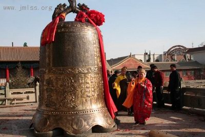 南门外排起了迎接大钟的长龙,寺院内聚满了前来观赏祈福的人们,有年已花甲的长者,有富有时代气息的少年,也有与父母结伴而来的小朋友。约至上午11时,随着震耳欲聋的鞭炮声,载着“鸠摩罗什寺罗什平安”的大卡车缓缓而至,顿时鞭炮声、佛乐声汇成一片,礼花爆竹冲天而起,在空中绽放成一朵朵美丽的莲花,佛光、竹光、心光,光光辉映;可谓人天同庆,因缘殊胜。在罗什寺住持理智法师的指挥下,大钟被安全的安置在大雄宝殿一层平台上。