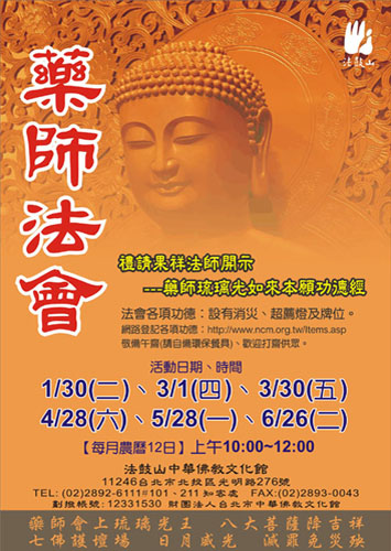 据法鼓山全球资讯网消息:台湾“中华佛教文化馆”将分别于1月30日、3月1 日、3月30日、4月28日、5月28日和6月26日(即:每月的农历十二日)的上午10:00~12:00举办药师法会,届时将礼请果祥法师开示——药师琉璃光如来本愿功德经。此次活动的地点设在台北市北投区光明路276号。